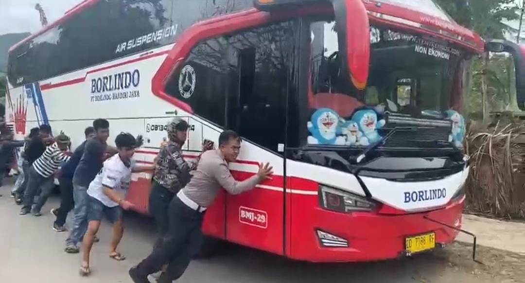 Kepala Satlantas Polres Palopo, Iptu Siswaji yang berada di sekitar lokasi bersama warga, langsung mengambil inisiatif mendorong mobil bus yang mogok tersebut.